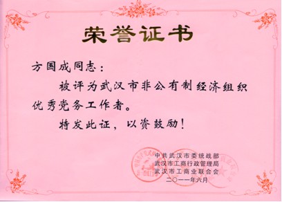 2011年6月,党委书记方国成同志被评为武汉市非公有制经济组织优秀党务工作者